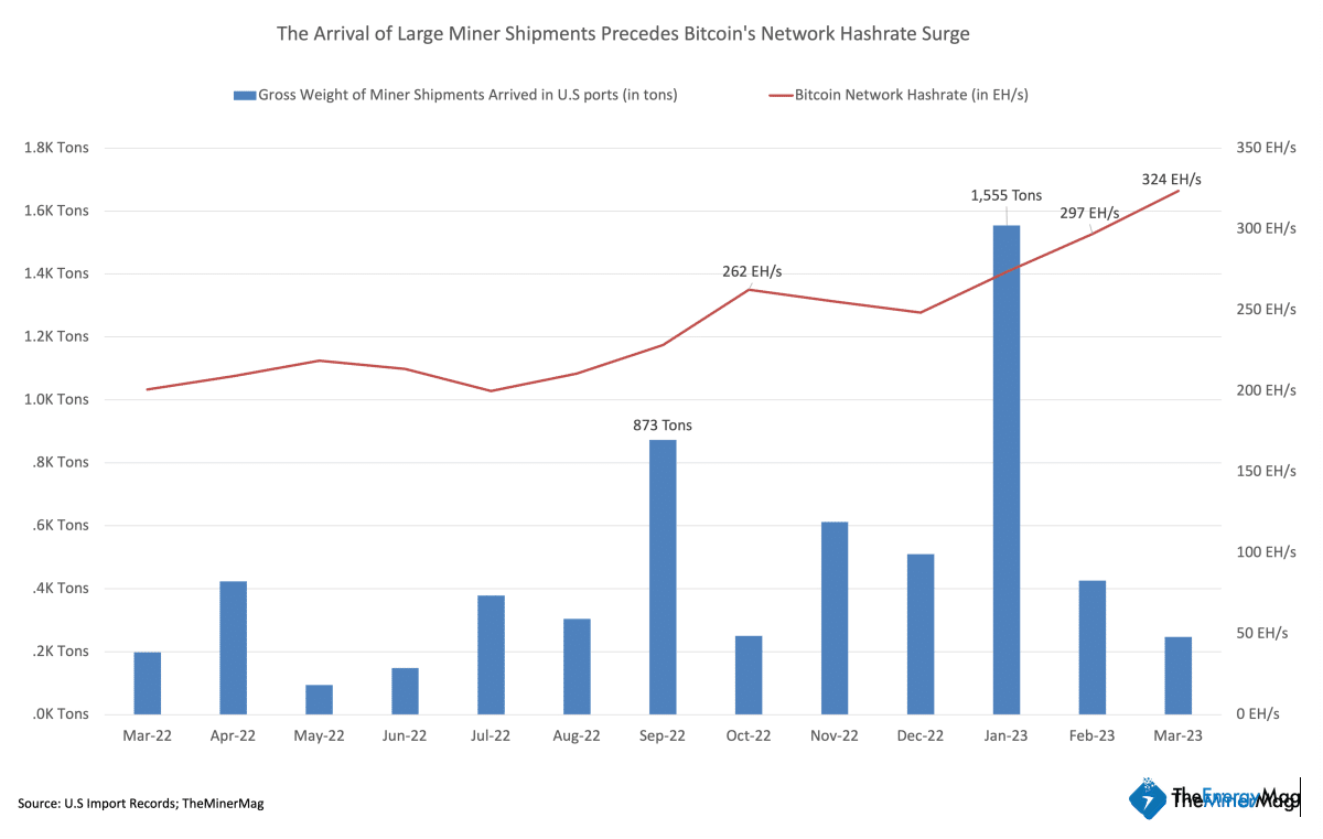 Although the data only represented shipments into one country, it’s still interesting to see sharp increases in bitcoin’s hashrate (and hence network difficulty) in the following month(s), i.e. October 2022 and February 2023. Based on the trend reflected in the chart, if there’s no major uptick in the shipment gross weight in the rest of March and into April, the growth rate of bitcoin’s network hashrate may gradually slow down.