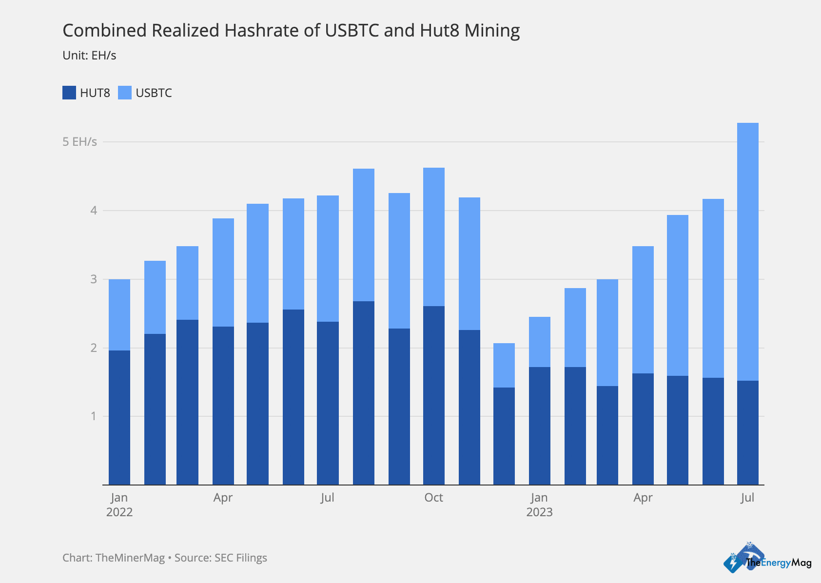 Based on USBTC’s monthly disclosures until July, the combined realized proprietary hashrate with Hut 8 reached a little over 5 EH/s at the time, making the new entity one of the largest 10 public mining companies by bitcoin production.