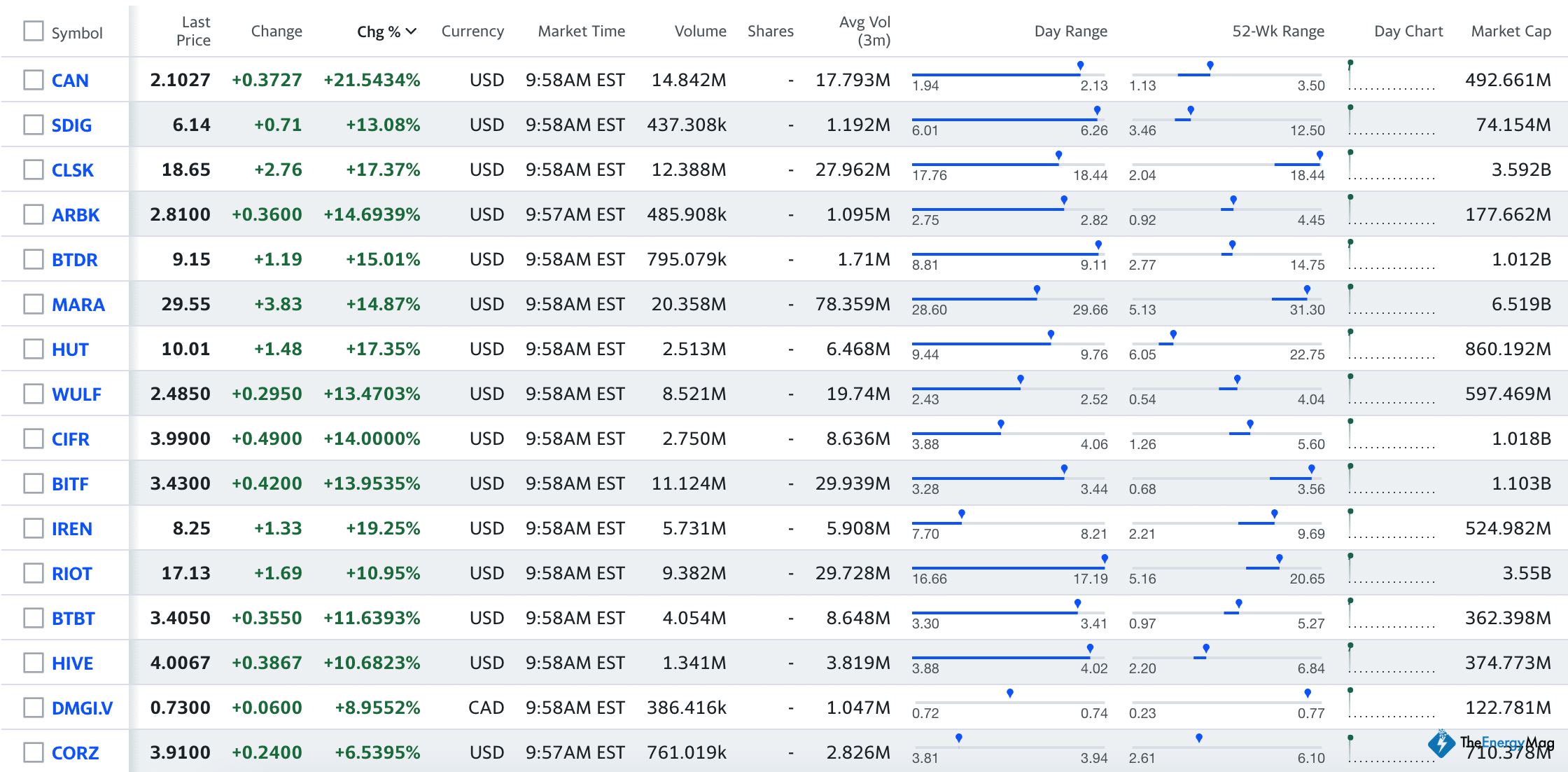 As of writing, 16 North American bitcoin mining stocks with a 3-month average trading volume of at least $1 million are changing hands at gains between 6.5% to 22%.