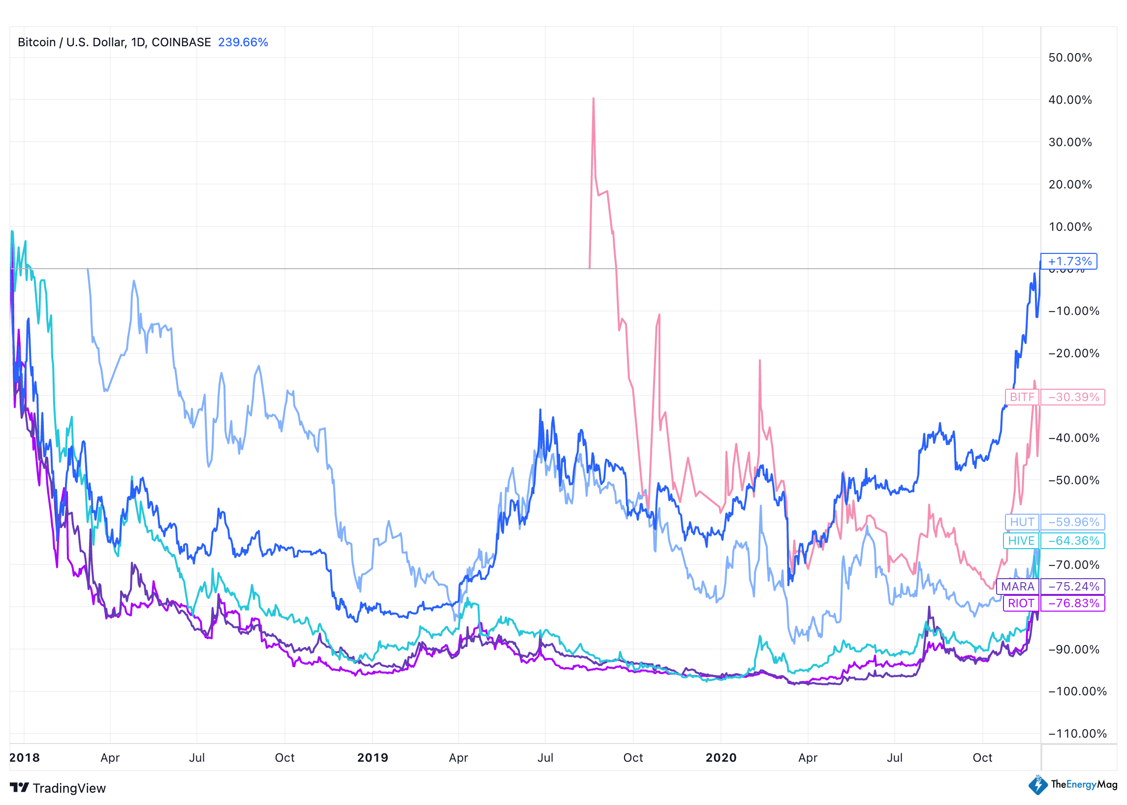 In December 2017, Bitcoin touched the $19,500 mark for the first time ever and did not regain that level until December 2020. During those three years, there were only five public mining stocks in North America: Marathon, Riot, Hut 8 (NASDAQ: HUT), HIVE, and Bitfarms. Similarly, they all underperformed compared to bitcoin at the time.
