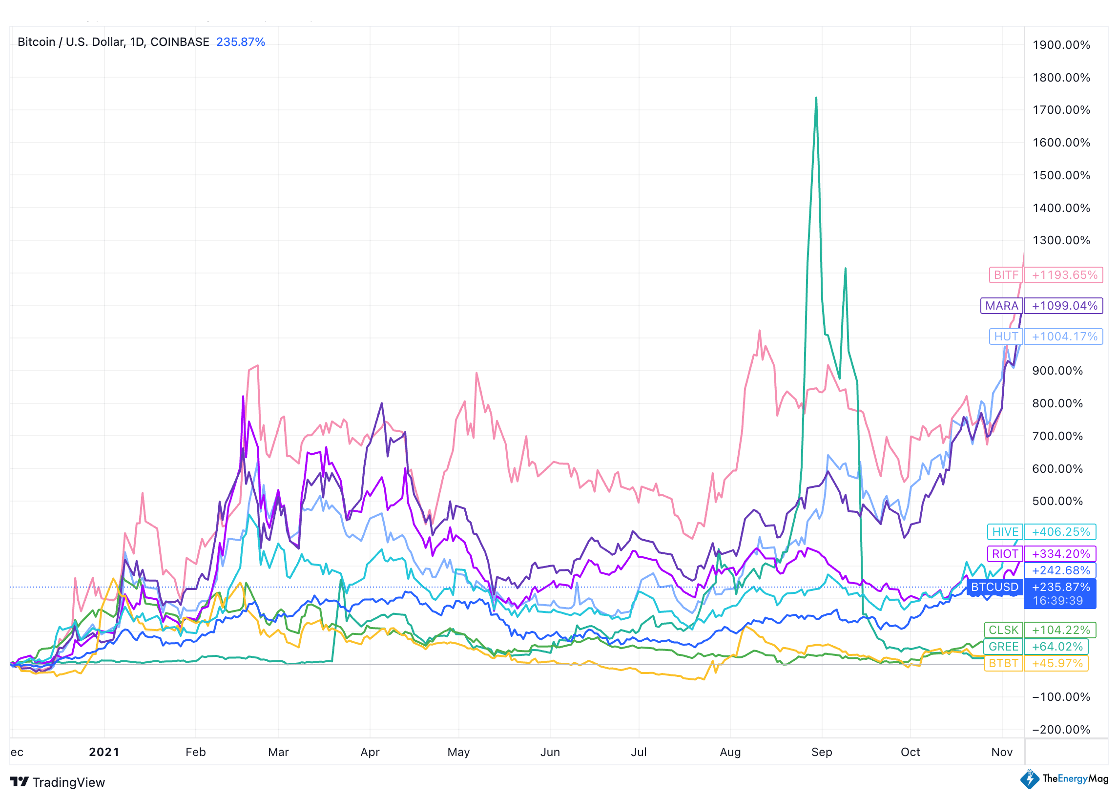 Bitcoin started a bull run from $19,500 in December 2020 to $69,000 in November 2021. During those 11 months, the five mining stocks that existed before December 2020 all managed to outrun bitcoin by notable margins.