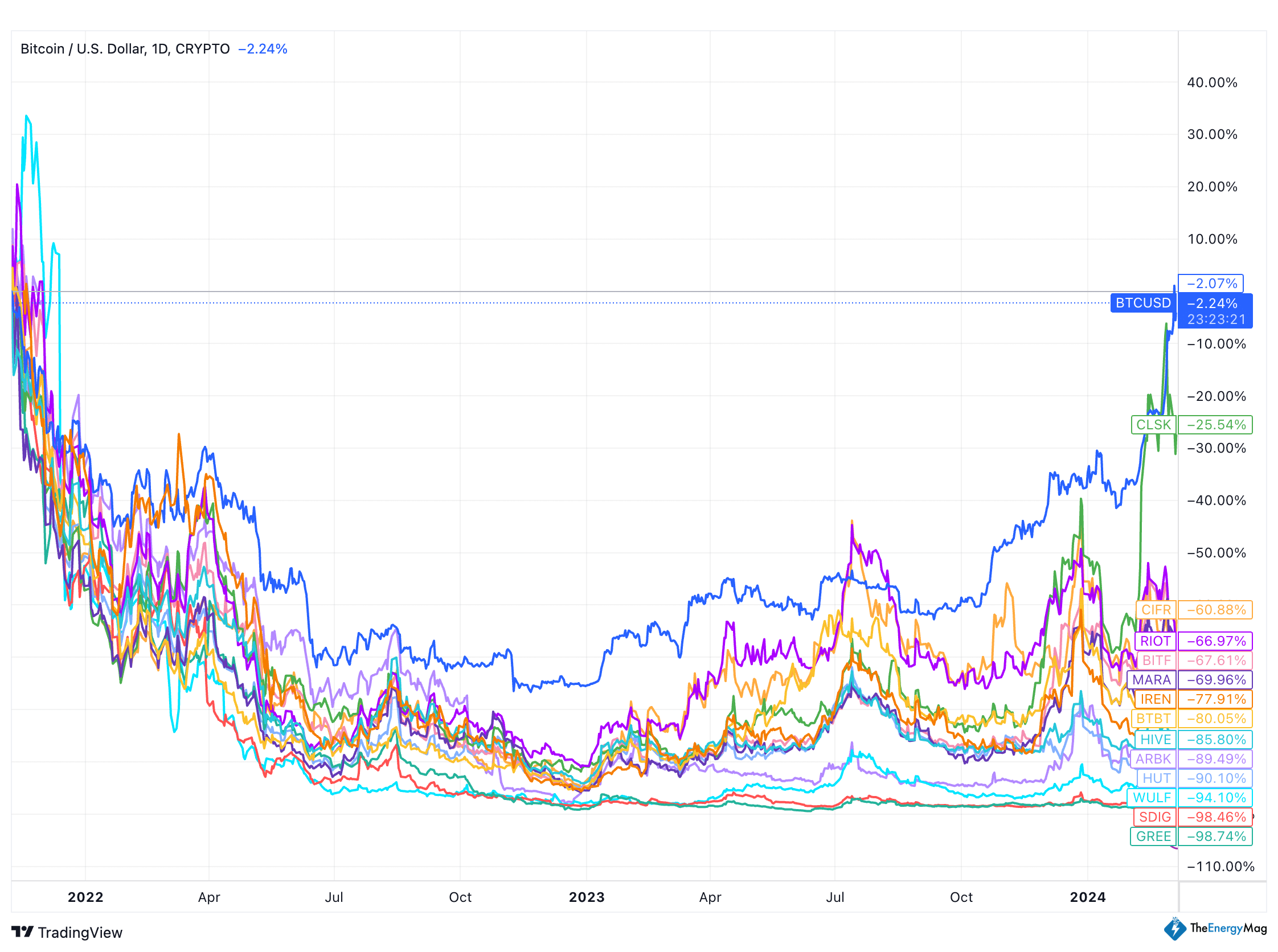 Bitcoin started the New Year at around $42,000. It recorded a gain of 50% year-to-date as of Mar. 6. The chart below shows that mining stocks largely underperformed compared to bitcoin, except for CleanSpark matching up with bitcoin’s rally.