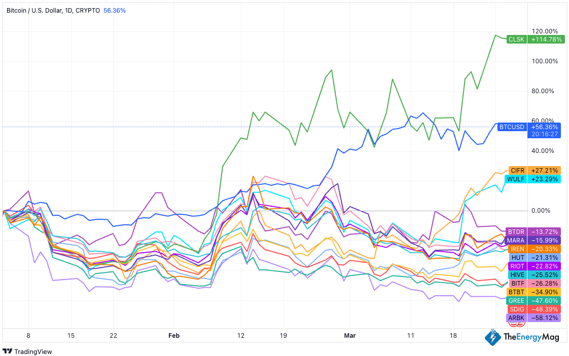 CleanSpark’s share price has experienced a notable rally this year, being the only bitcoin mining stock that has outperformed bitcoin year-to-date, as the chart below shows.