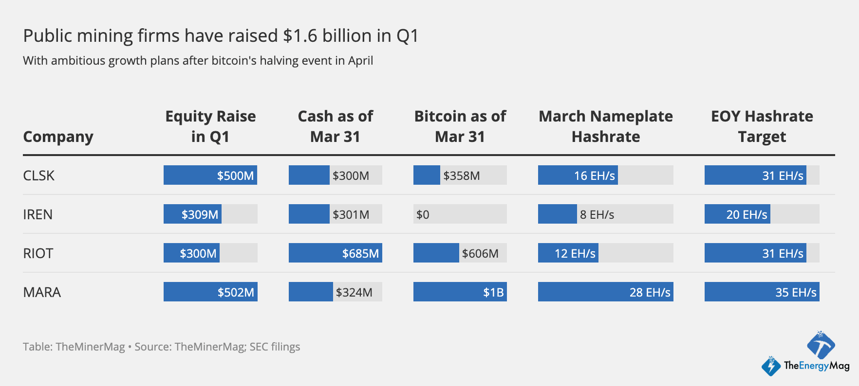 According to recent production updates and SEC filings, CleanSpark, Iris Energy, Marathon and Riot are estimated to have raised $1.6 billion in Q1 ahead of bitcoin’s halving event, dwarfing the $1.25 billion they raised in Q3 and Q4 last year.