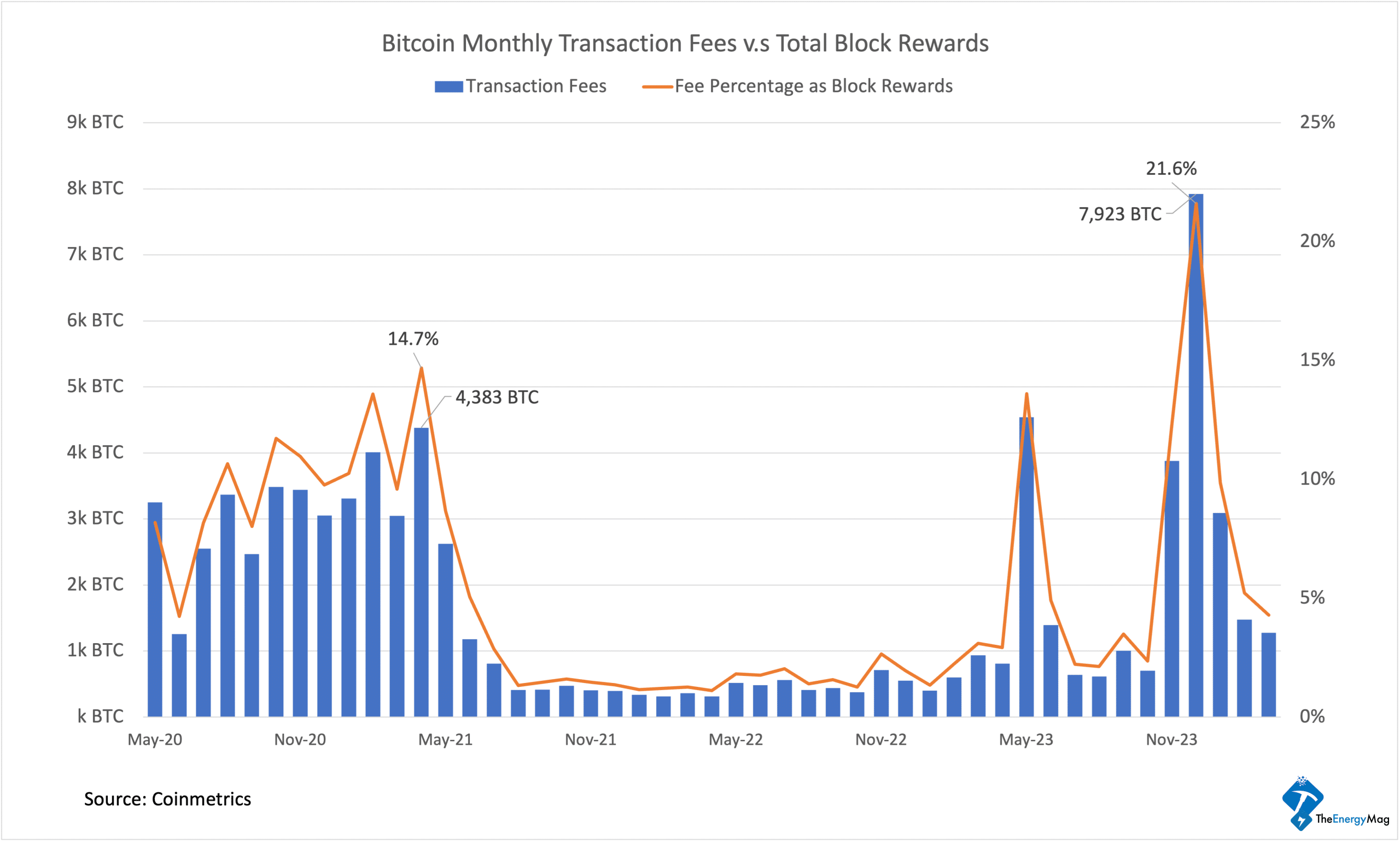 In the months after the May 2020 halving, bitcoin’s monthly transaction fees began to rise amid the bull run, reaching a local peak of 14.7% of block rewards in April 2021 before subsiding to an average of 3%. It kept at around 3% until the spike of inscription activities in May and December 2023.