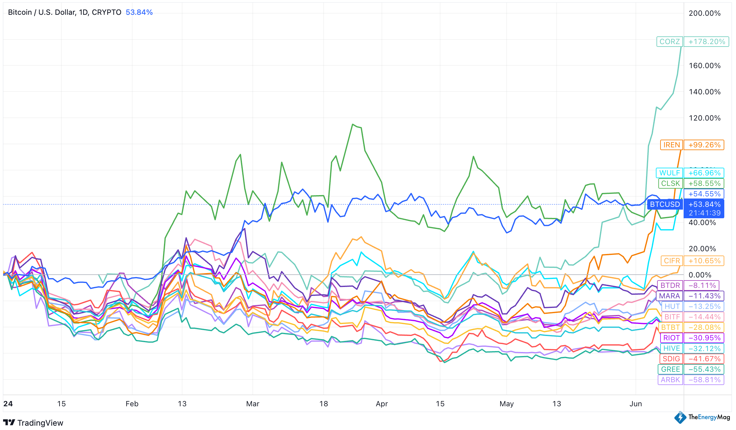 According to TradingView’s data below, Core Scientific (NASDAQ: CORZ) and Iris Energy had a solid rally over the past week riding on the AI and HPC trend and setting new 52-week highs. Others like Terawulf, Bit Digital (NASDAQ: BTBT), Bitdeer, Marathon, Bitfarms, and Hut8 have also posted double-digit growth since the halving.