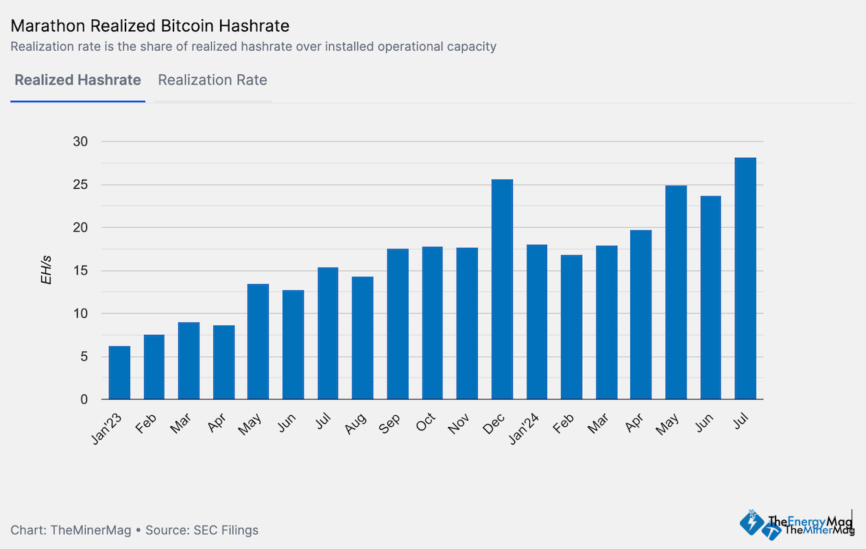 Despite the hashrate reduction in Granbury, Marathon increased its total realized hashrate to 28.17 EH/s after mining 692 BTC last month.